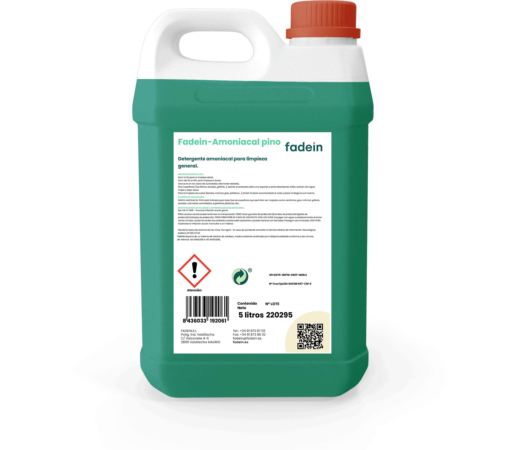 Fadein-Amoniacal Pine is a detergent that combines the high degreasing power of pine with the cleaning power of ammonia. It revives the shine and has a great cleaning power for all types of washable surfaces. Does not damage surfaces, easy to rinse without leaving residues. It is suitable for all types of surfaces that can be wet such as: ceramic, stoneware, marble, taps, tiles, chrome, enameled, plastic surfaces, etc….