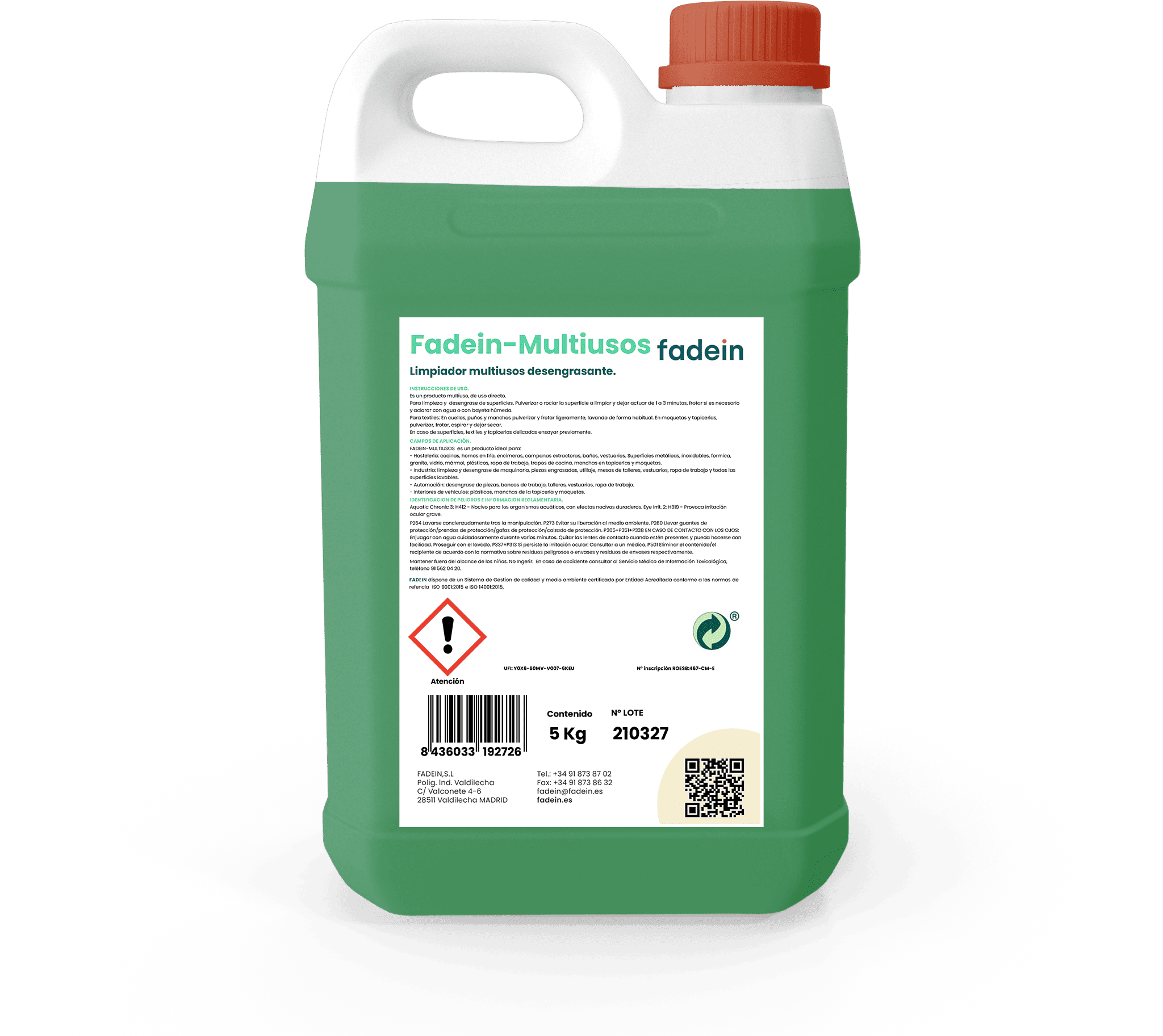 FADEIN-MULTIUSOS is a multipurpose degreaser that, due to its balanced composition, confers a great detergent and degreasing power on all types of surfaces, fabrics and others that require a deep cleaning of grease, oils, pollution fumes and all types of difficult dirt. It is an ideal product for: