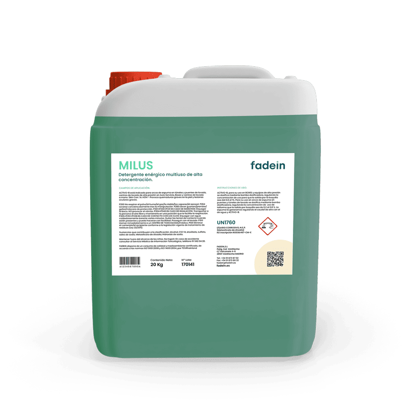 MILUS is a multi-purpose degreaser that, due to its balanced composition, confers a great detergent and degreasing power on all types of surfaces, fabrics and others that require a deep cleaning of grease, oils, pollution fumes and all types of difficult dirt, with a small amount of Milus a fast degreasing action is obtained: